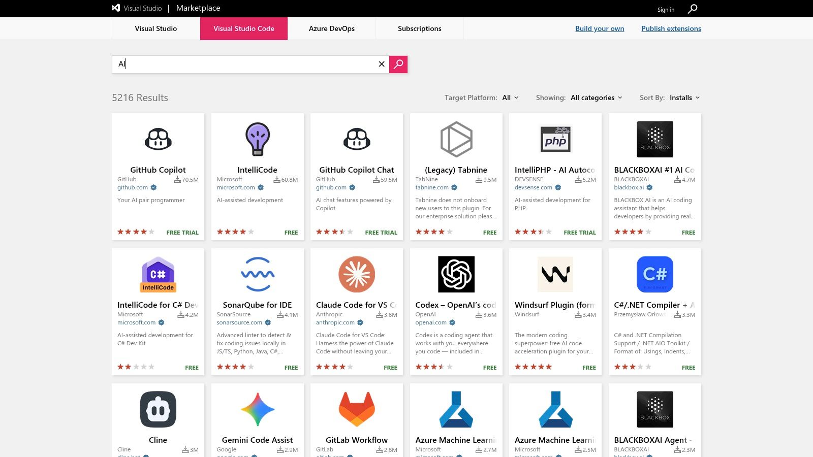 Visit Website: https://marketplace.visualstudio.com/search?term=AI&target=VSCode&category=All%20categories&sortBy=Installs