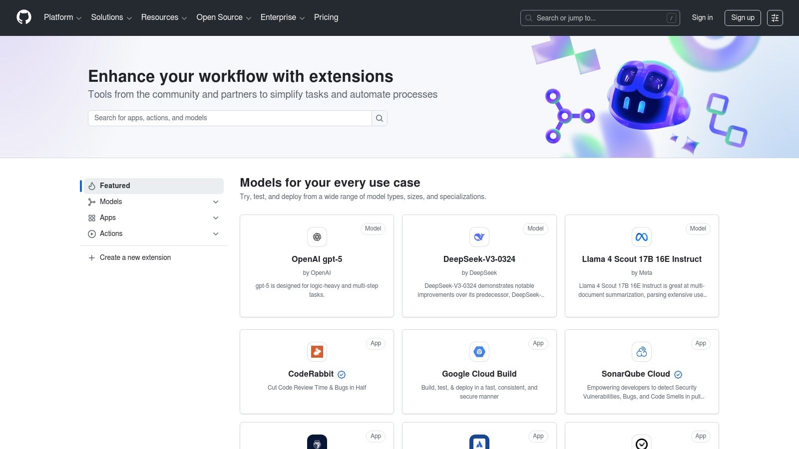 Beyond its Copilot suite, GitHub Marketplace has become a hub for discovering and integrating third-party AI-powered applications. It serves as a catalog of AI-assisted Apps and Actions, allowing teams to find tools for tasks like automated code review and security scanning. This approach makes it a platform for finding tools that plug into a GitHub environment.