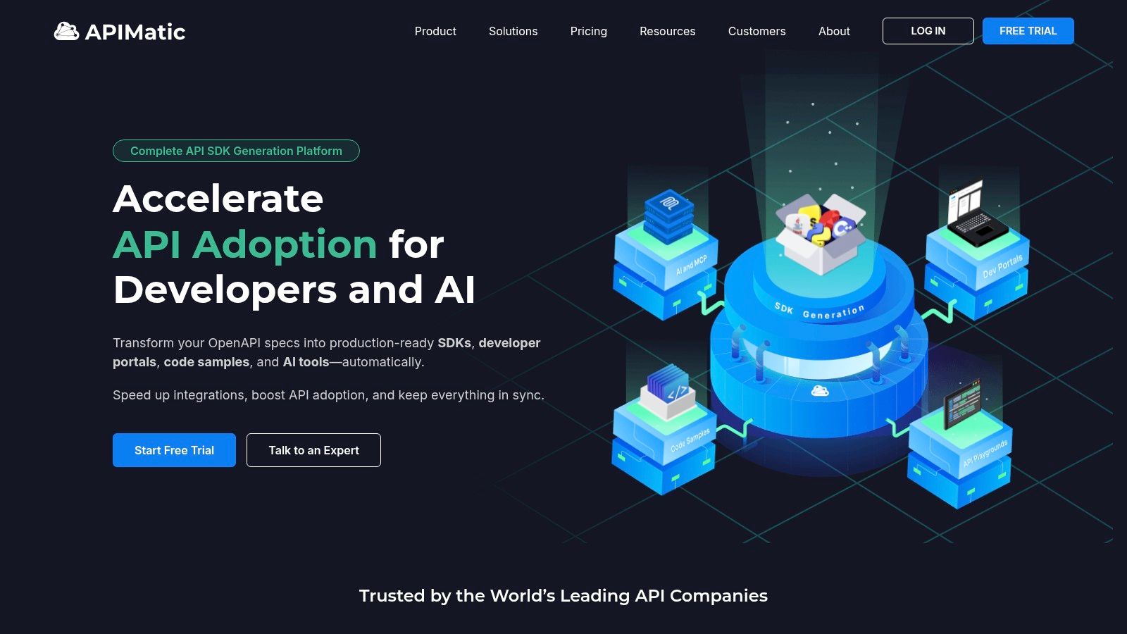 APIMatic focuses on the developer experience with an emphasis on SDK (Software Development Kit) generation. It aims to drive API adoption by providing developers with ready-to-use code. The platform ingests an API definition file (like OpenAPI) and automatically generates an interactive API portal and SDKs in multiple languages. This approach still requires a manually created API definition as the source.
