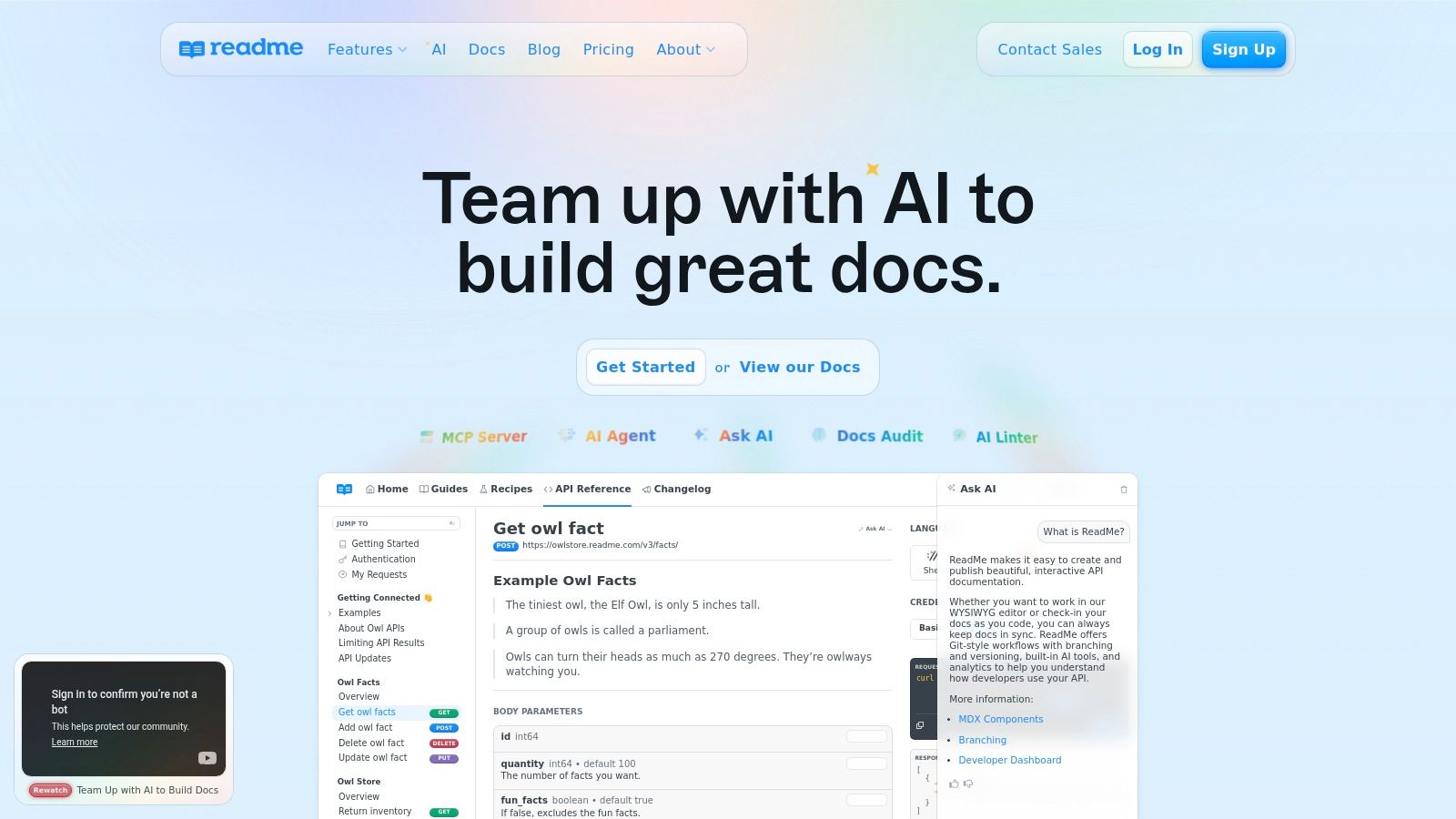 ReadMe is a developer hub platform designed for companies that need an interactive API experience. It creates an ecosystem around an API, combining documentation with usage metrics and developer logs. This focus on interactivity makes it a potential choice for API-first products. The platform allows developers to not just read about an API but to use it directly within the documentation.