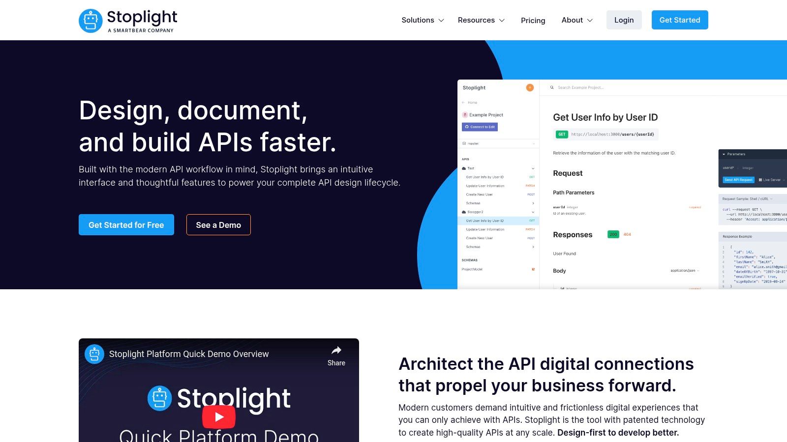 The Stoplight Platform also promotes a design-first approach, providing a collaborative suite for designing, mocking, and documenting APIs using the OpenAPI Specification. Its visual editor and governance features are meant to help teams create consistent example API documentation before backend code is written.