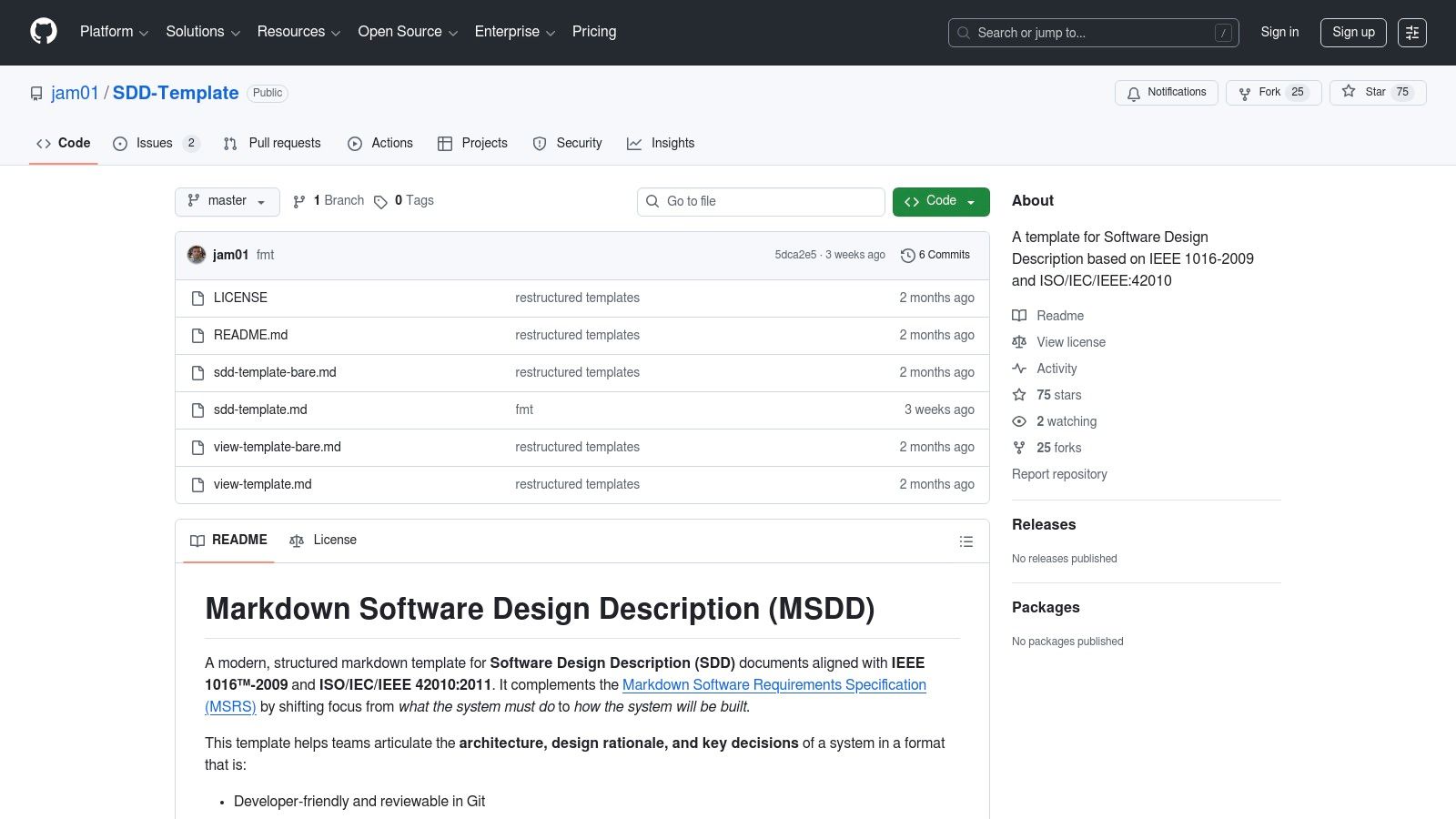 For teams embracing a “documentation-as-code” philosophy, this open-source Markdown Software Design Description (MSDD) template on GitHub is a resource. It aligns with formal standards like IEEE 1016-2009 and ISO/IEC/IEEE 42010, providing a structured, developer-centric framework. Instead of a SaaS platform, this is a version-controlled template that lives alongside your source code, making it a natural fit for Git-based workflows.
